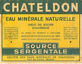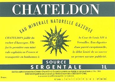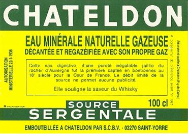 Cette Eau Minérale naturelle jaillie du Rocher d'Auvergne . Sa vente est réservée à certaines régions de France en raison du débit limité de cette Source exceptionnelle . Sont trés léger gaz naturel et les soins apportés au captage en font la meilleure des Eaux de régime . Sa pureté en fait l'Eau de Table la plus légère et la plus digestive . La Source " Sergentale " appartient à la Société des Eaux Minérales de Chateldon ( Puy-de-Dome )