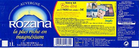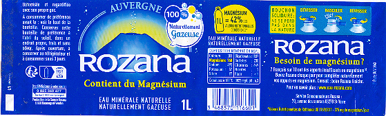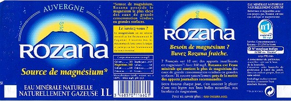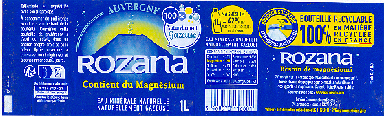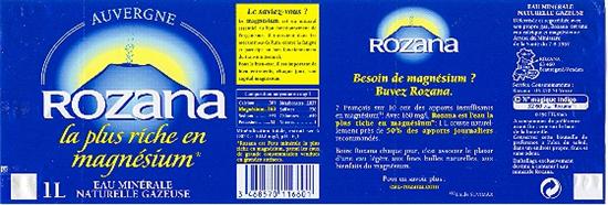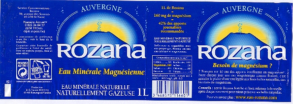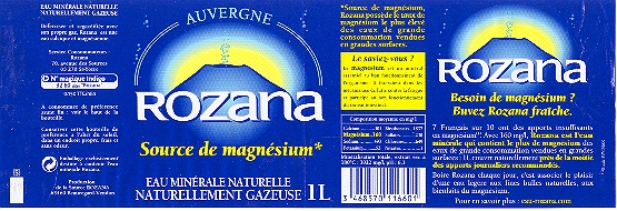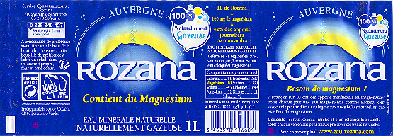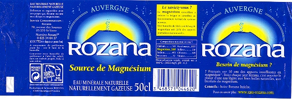Comme 7 Français sur 10 , vous manquez peut-être de magnésium . Avec 160 mg/l , Rozana est l'Eau la plus riche en magnésium : 1 litre couvre naturellement 50 % des Apports Journaliers recommandés . Boire Rozana chaque jour , c'est associer le plaisir d'une Eau légère , finement pétillante , aux bienfaits du magnésium . Rozana , connue depuis l'Antiquité pour ses vertus bienfaisantes , émerge au Hameau de Rouzat dans le Département du Puy de Dome ( 63 ) .