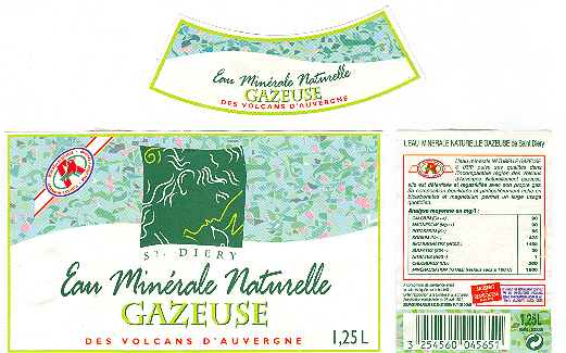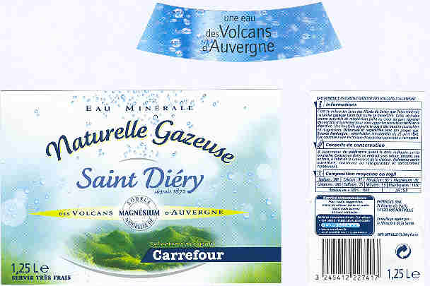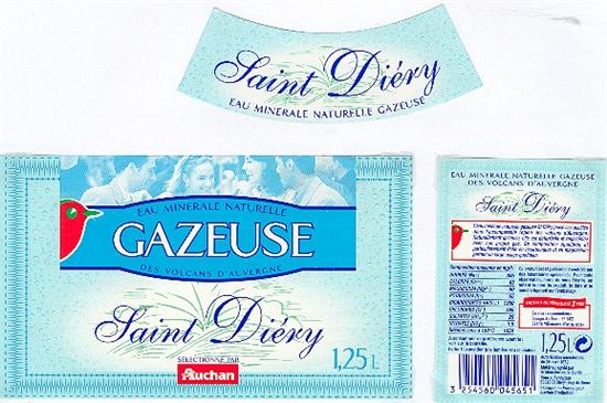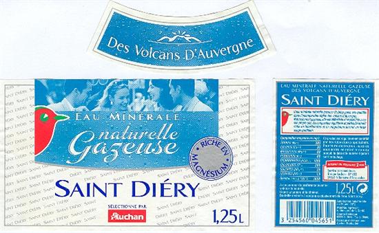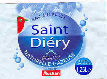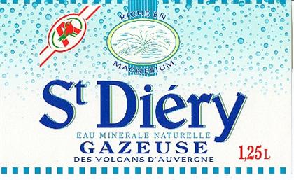 L'Eau Minérale Naturelle Gazeuse St Diery puise ses qualités dans l'incomparable région des Volcans d'Auvergne . Naturellement gazeuse , elle est déferrisée et regazéifiée avec son propre gaz . Sa composition équilibrée et particulièrement riche en bicarbonates et en magnésium permet un large usage quotidien .